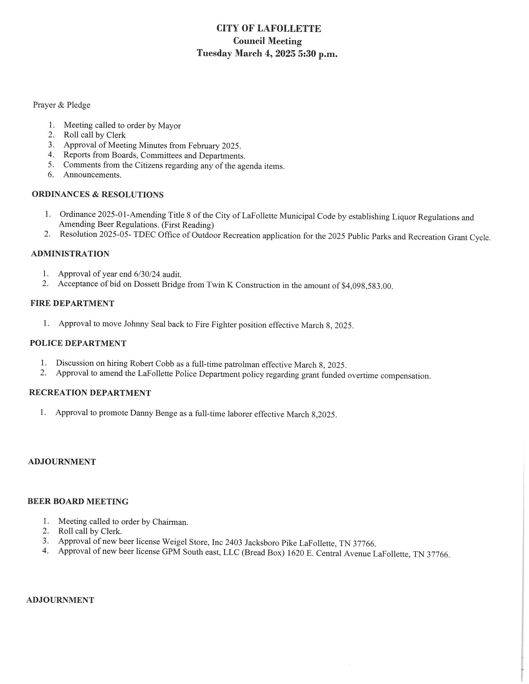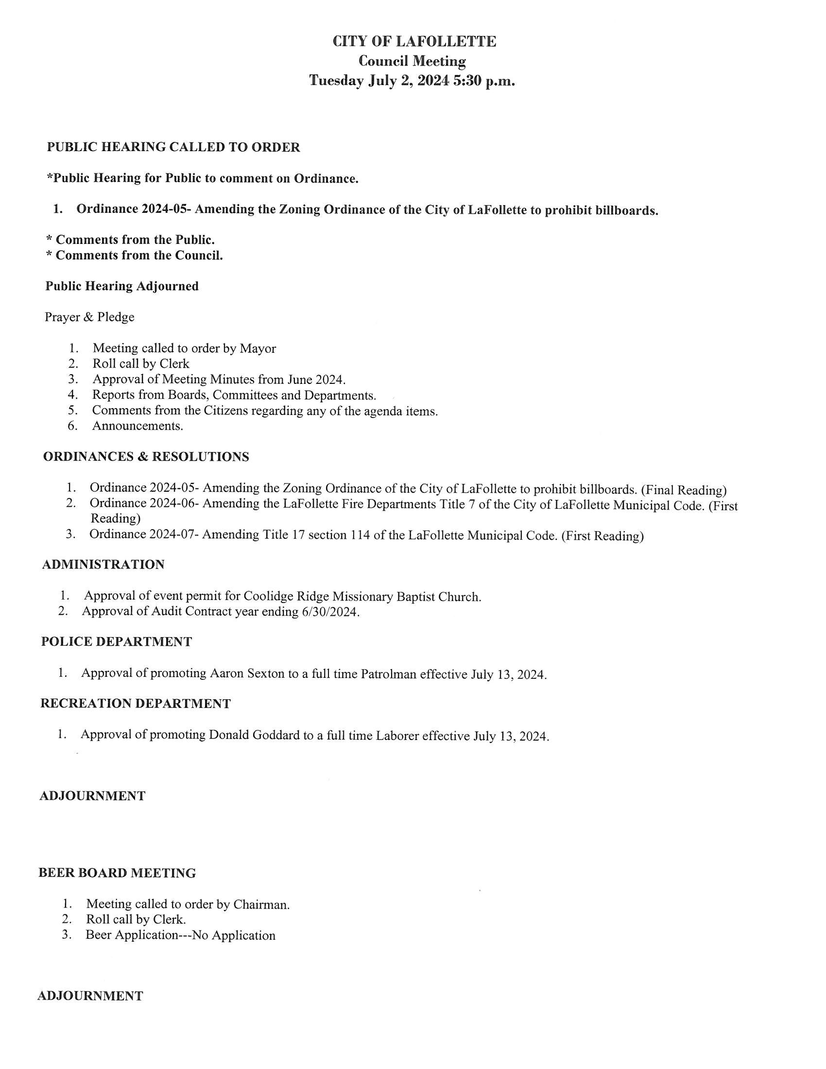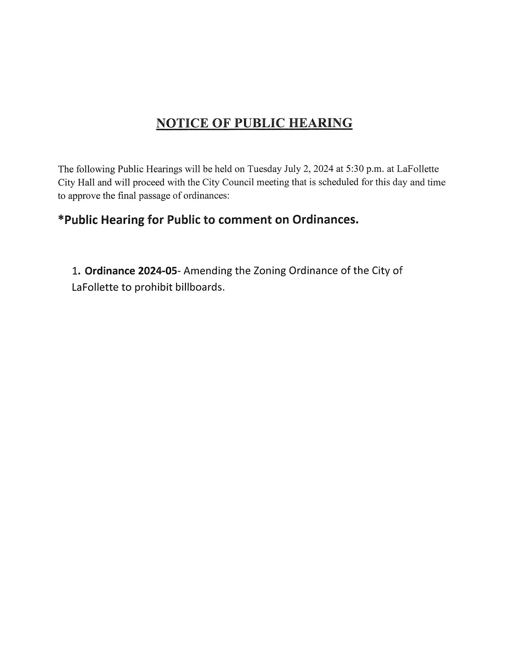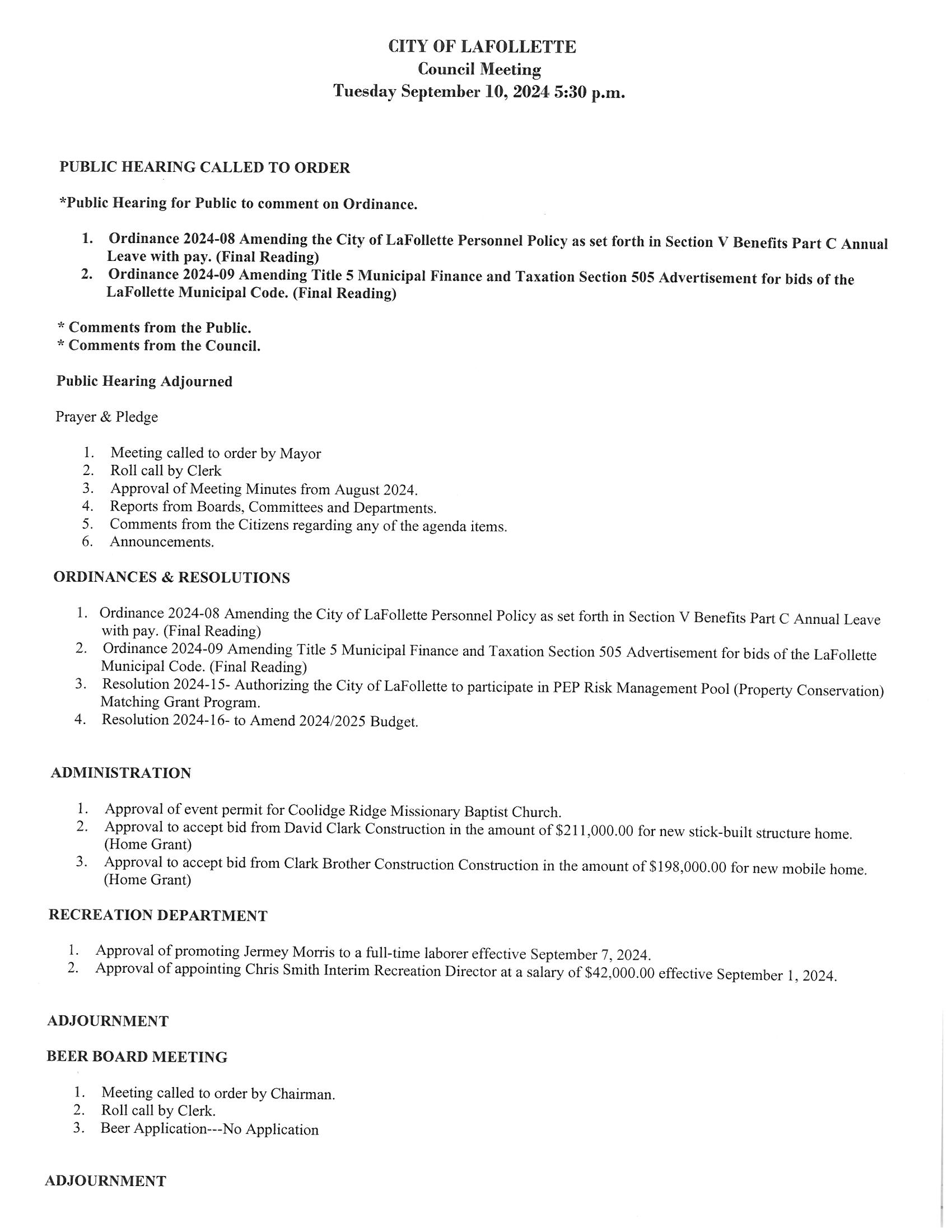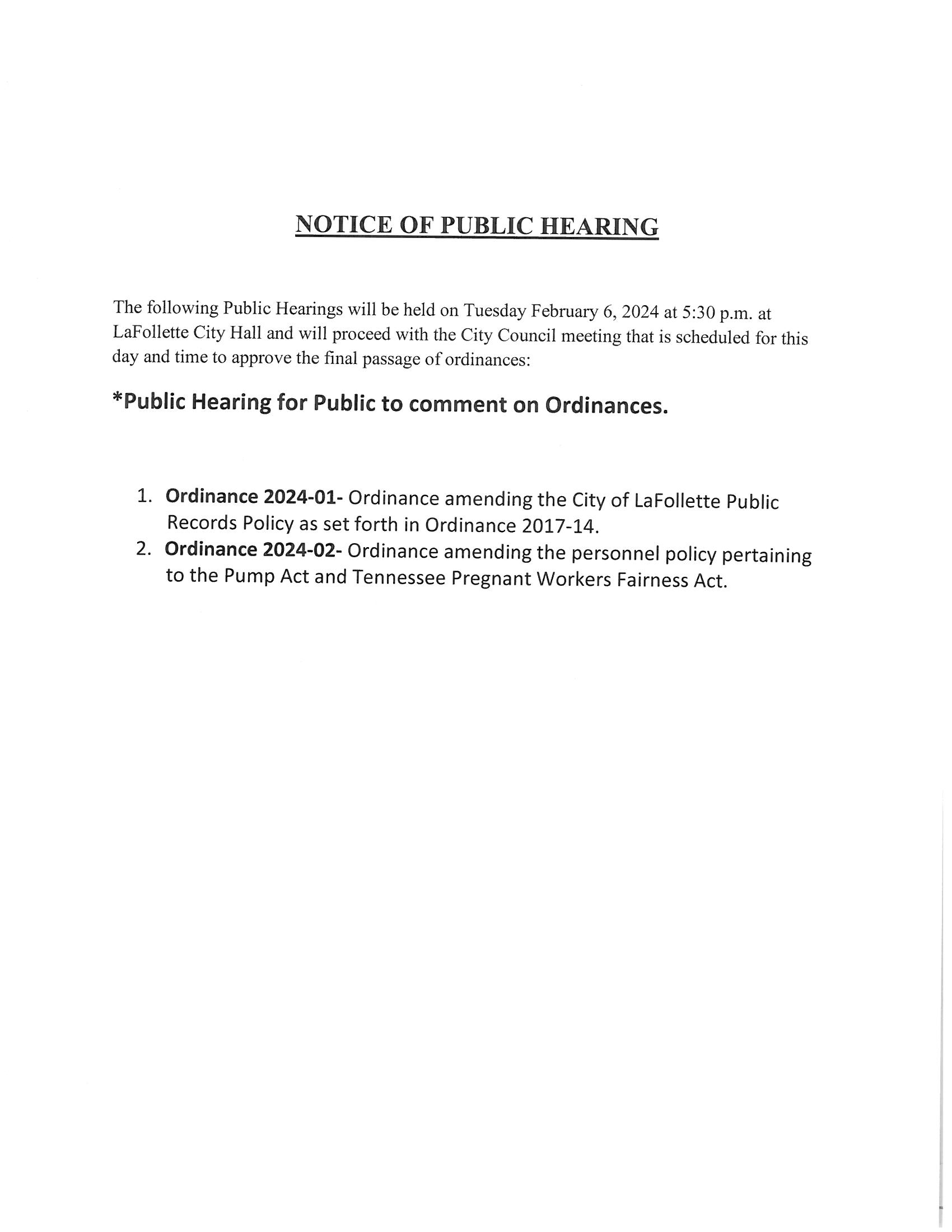 All Public Hearings and City Council Meetings are held in the Council Room at the City of LaFollette Municipal Building. Meeting are held on the 1st Tuesday of each month at 5:30PM.