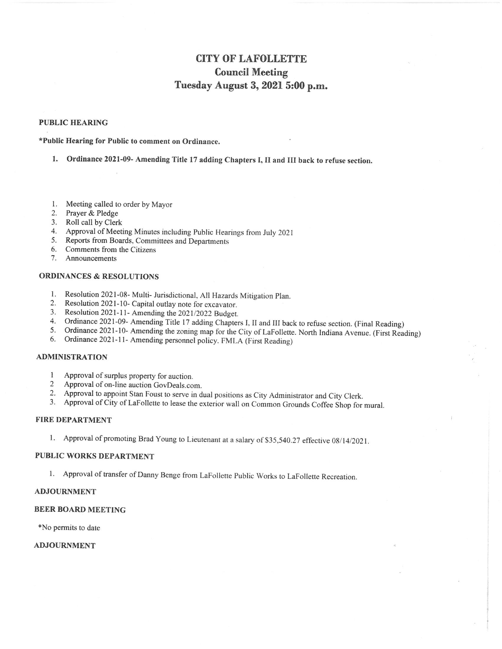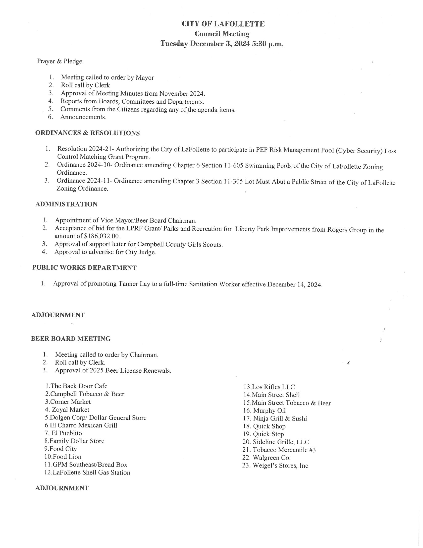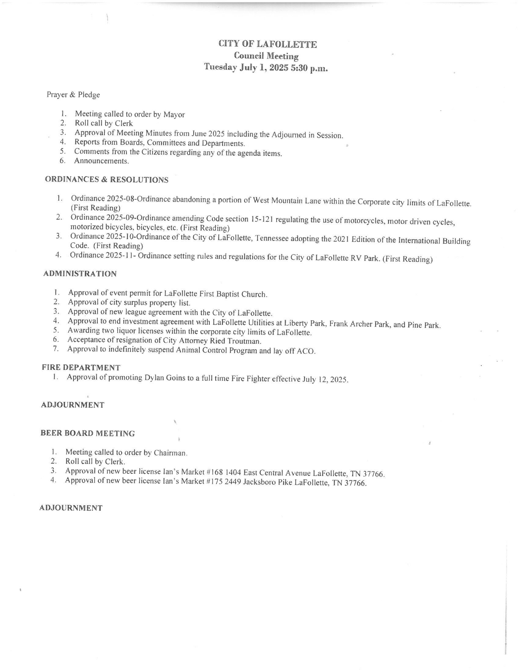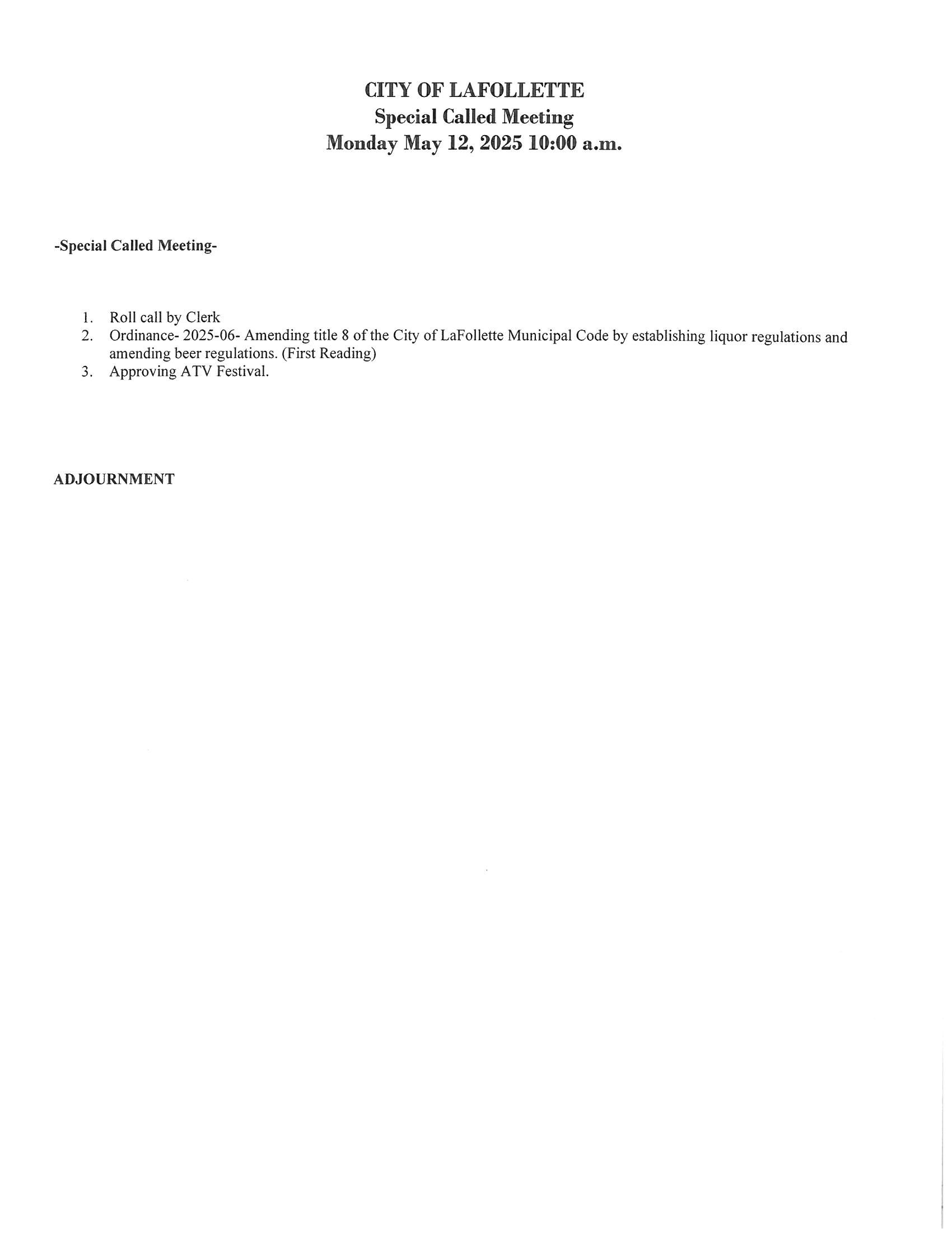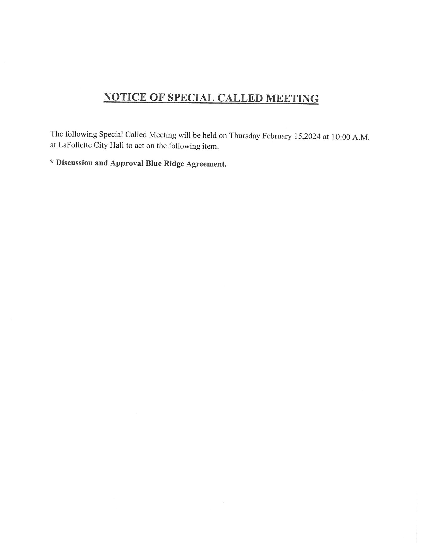 All Public Hearings and City Council Meetings are held in the Council Room at the City of LaFollette Municipal Building. Meeting are held on the 1st Tuesday of each month at 5:30PM.